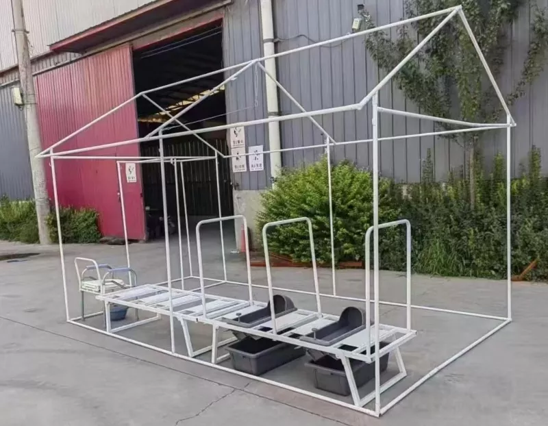 आपतकालीन प्रकोप राहत शौचालय टेन्टमा डबल-स्लोप ठाडो पर्खाल संरचना छ। स्टिल फ्रेमले एन्टि-रस्ट उपचारबाट गुज्र्छ, क्यानोपीले वाटरप्रूफ र ज्वाला-प्रतिरोधी सामग्रीहरू प्रयोग गर्दछ, र सेनेटरी वेयर उच्च-शक्तिको सामग्रीबाट बनेको हुन्छ सटीक आयामहरू मोल्ड गठनद्वारा सुनिश्चित गरिन्छ। सेन्सर प्रकाश प्रणालीले वाटरप्रूफ र शॉकप्रूफ परीक्षणहरू पार गरेको छ, बाहिरी प्रयोगको लागि उपयुक्त। मोड्युलर डिजाइन अवधारणा अपनाएर, टेन्टले द्रुत एसेम्बली र डिस्सेम्बल गर्न सक्षम बनाउँछ — स्टिल फ्रेम जडानहरूले स्न्याप-अन जोइन्टहरू प्रयोग गर्दछ, जसले उपकरण-रहित सेटअपलाई अनुमति दिन्छ। भेन्टिलेसन प्रणालीले आन्तरिक हावा परिसंचरण कायम राख्न कीट-प्रूफ स्क्रिनहरू सहितको संवहन डिजाइन अपनाउँछ।